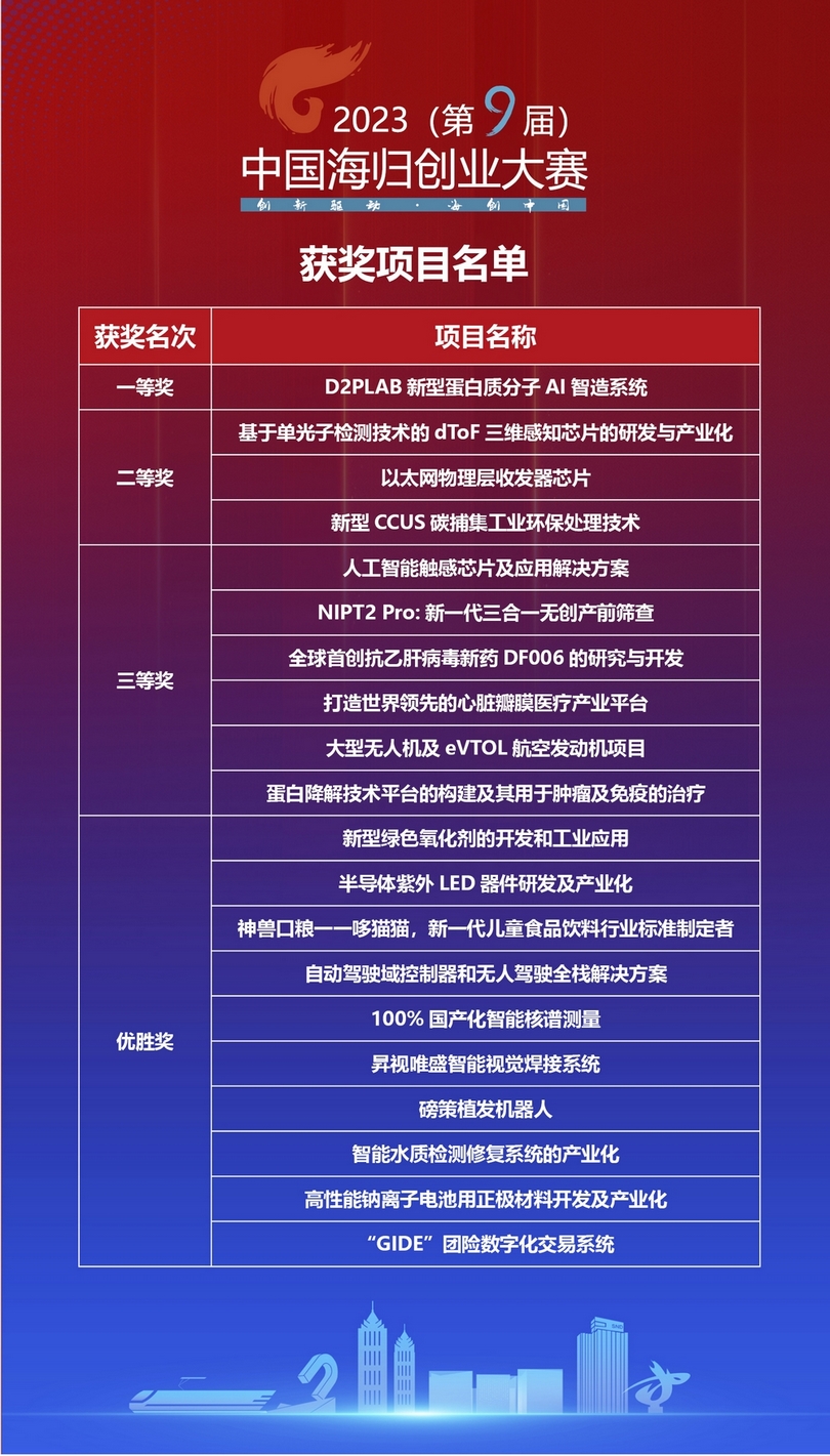 復賽項目按照行業(yè)分組進行路演,由來自啟迪創(chuàng)投、華軟資本、晟唐創(chuàng)投、中信建投、寅宜投資、北汽投資、杉杉創(chuàng)投、民生證券等機構的35位資深投資人組成評委團,從團隊、技術、市場、財務四個維度進行評審打分,確定20個項目晉級決賽。在決賽中,由來自中泰證券、財通創(chuàng)新、創(chuàng)客幫投資、蘇高新創(chuàng)投、華鍔投資、乾融控股、毅達資本的7位專業(yè)評委對晉級項目作出最后評定。最終,“D2PLAB新型蛋白質分子AI智造系統(tǒng)”項目奪得桂冠,“基于單光子檢測技術的dToF三維感知芯片的研發(fā)與產(chǎn)業(yè)化”“以太網(wǎng)物理層收發(fā)器芯片”“新型CCUS碳捕集工業(yè)環(huán)保處理技術”3個項目獲得二等獎,“人工智能觸感芯片及應用解決方案”等6個項目獲得三等獎,另有10個項目獲得優(yōu)勝獎。