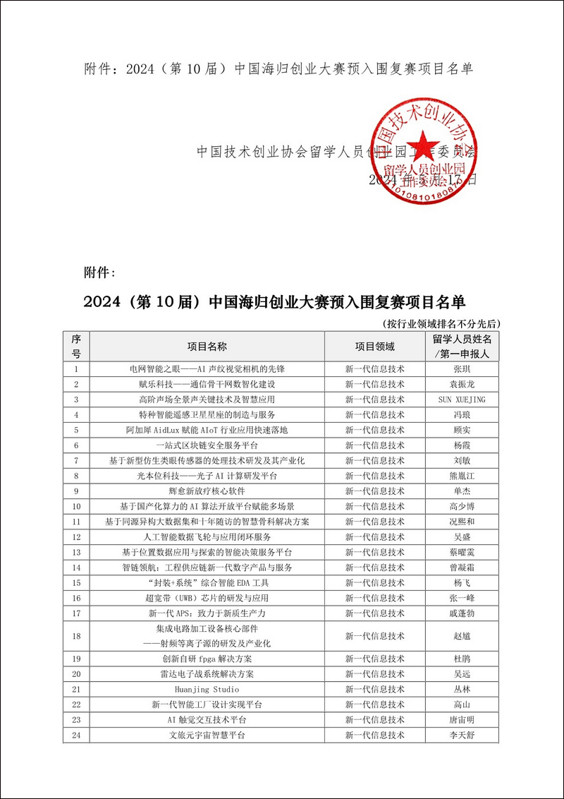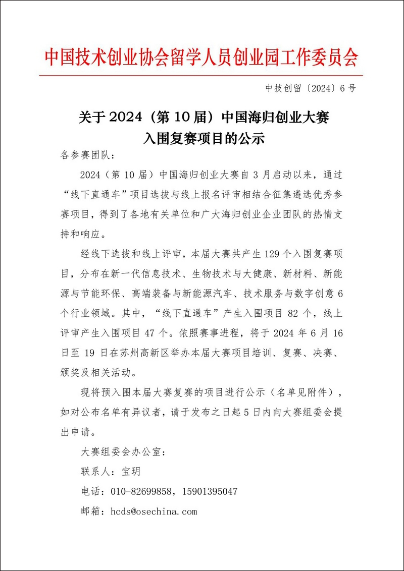 發(fā)文時(shí)間:2024-05-17 發(fā)文單位:中國(guó)技術(shù)創(chuàng)業(yè)協(xié)會(huì)留學(xué)人員創(chuàng)業(yè)園工作委員會(huì) 中技創(chuàng)留〔2024〕6號(hào)