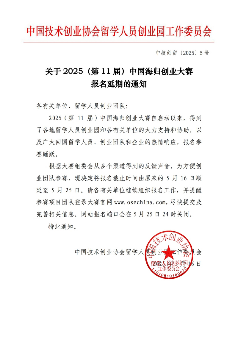 關(guān)于2025(第11屆)中國(guó)海歸創(chuàng)業(yè)大賽報(bào)名延期的通知